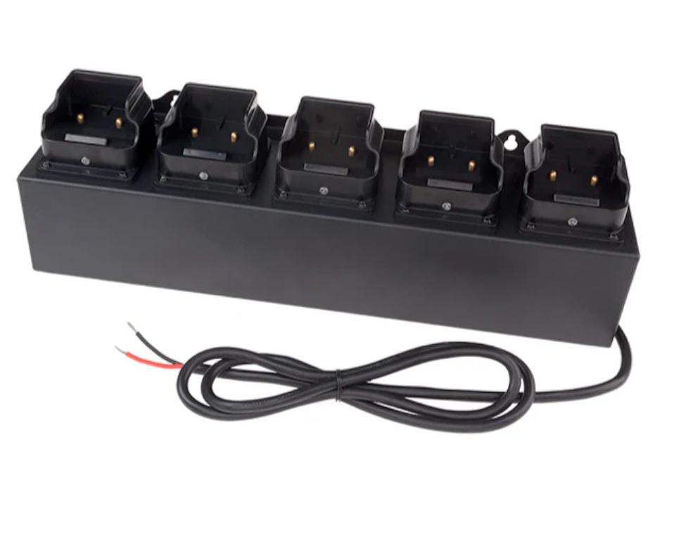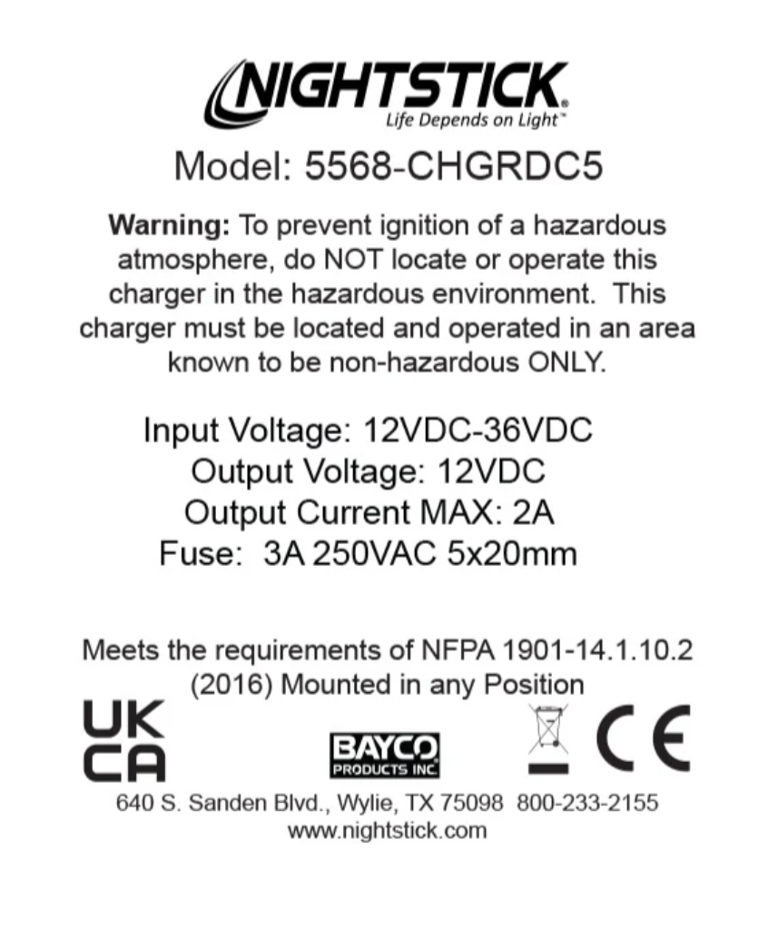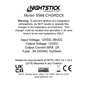 Nightstick (XPR5568-CHGRDC5) is a 5-bank charger designed for the 5568 Series INTRANT?? Angle Lights. It mounts horizontally and holds the lights vertically in five individual charging bays, providing organized multi-unit charging. This model includes a direct-wire DC power cord and is compatible with 12ƒ??36V DC systems, making it ideal for vehicle or mobile installations where reliable, simultaneous charging is needed.
