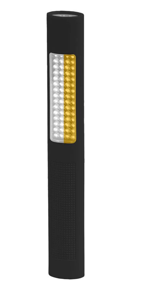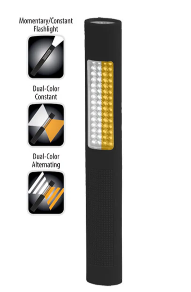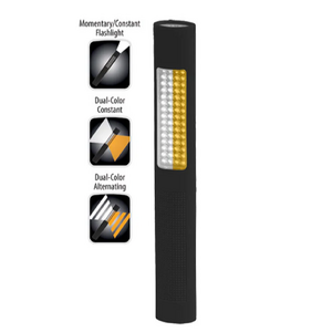 Nightstick (NSP-1176) Dual-Light Safety Light combines a full-size flashlight with a flood and flashing safety light in a compact, lightweight, all-LED design. It is operated by two body-mounted push buttons: the top button activates the tight-beam, long-throw flashlight in either momentary or constant-on mode, while the bottom button controls the safety light. Pressing the bottom button once turns on both sets of the white and amber safety lights at full power, and pressing it a second time switches them into an alternating strobe pattern between the two colors.