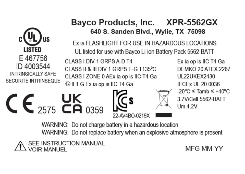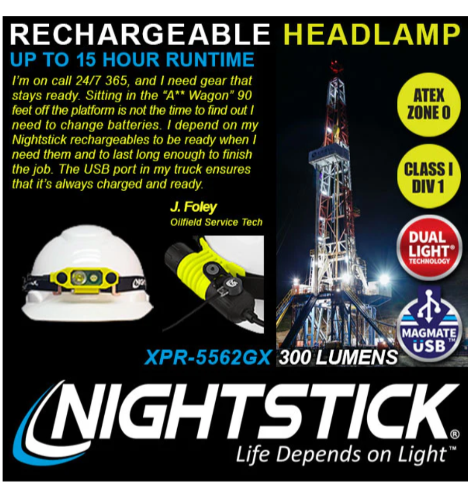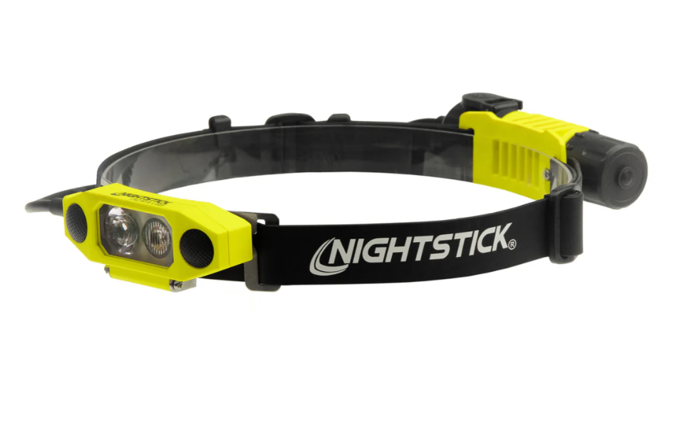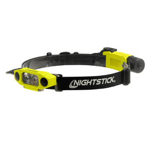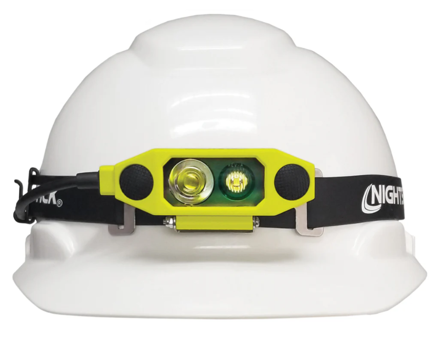 Nightstick (XPR-5562GX) is a USB Rechargeable Intrinsically Safe Dualƒ??Light headlamp, cULus, ATEX Zone 0 and IECEx listed as Intrinsically Safe. It is designed for use on hard hats and fire helmets with flipƒ??up face shields, with a unique lowƒ??profile shape that allows the shield to be raised or lowered without removing the headlamp. Constructed from engineered polymer, it features a multiƒ??position tiltƒ??head design. Both the spotlight and floodlight utilise LED technology with an advanced TIR lens to optimise lumen output and beam pattern. Enlarged frontƒ??mounted switches provide easy access to the spotlight for distance illumination, the floodlight for closeƒ??up tasks, and Dualƒ??Light mode for maximum versatility, safety and performance.