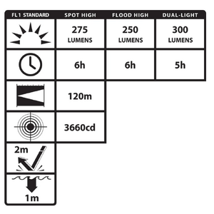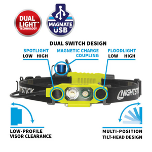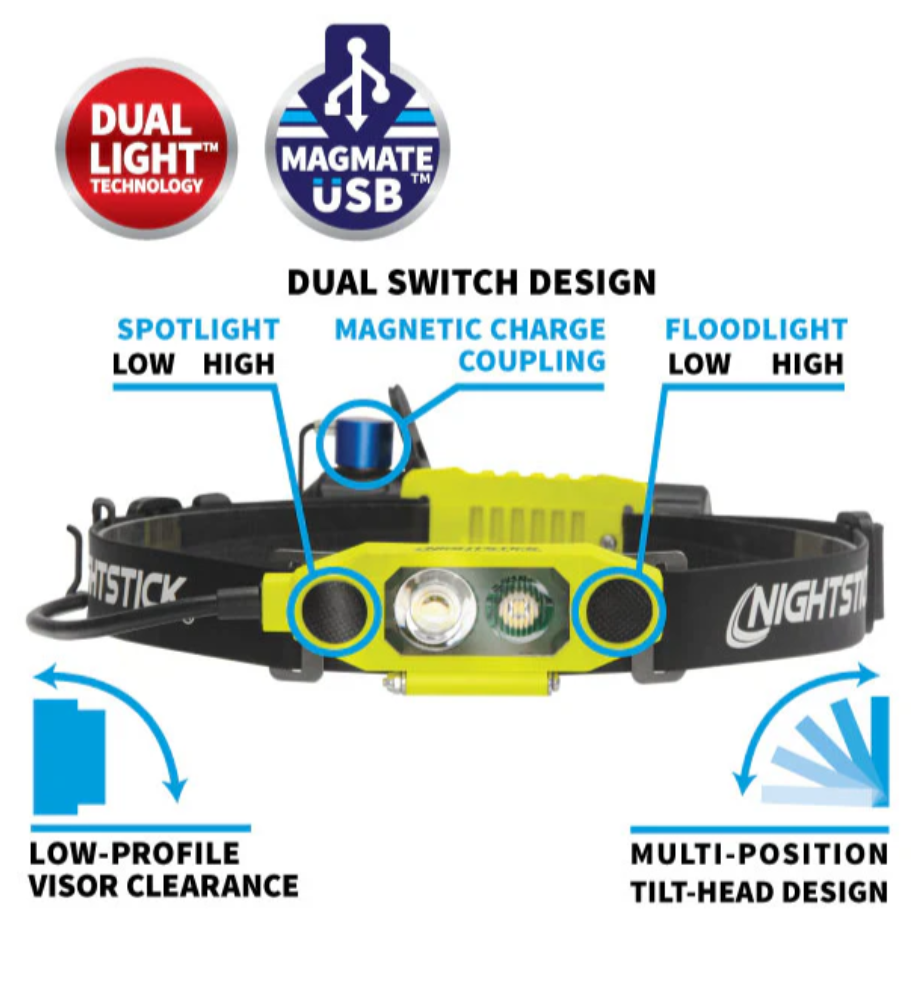Features cULus, ATEX and IECEx listed Intrinsically SafeLED technologyFocused high/low-brightness spotlight beam for distance illuminationUnfocused high/low-brightness wide-beam floodlight for close-up illuminationDual-Lightƒ?› (spotlight and floodlight on at the same time) for maximum versatilityEngineered polymer housing(TIR) Total Internal Reflection lens designed to optimize lumen output and beam patternDual switches located on the front of the lightAdjustable tilt headHeavy-duty rubber strap for fire helmets and hard hat applicationsIP-67 Dustproof / WaterproofImpact & chemical resistantMagMateTM Magnetic USB Recharge TechnologyLi-Ion Rechargeable battery (included)Limited Lifetime Warranty
