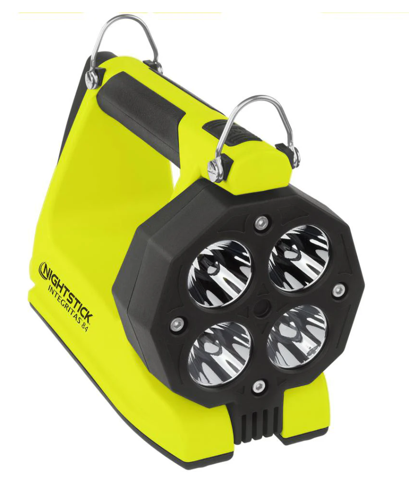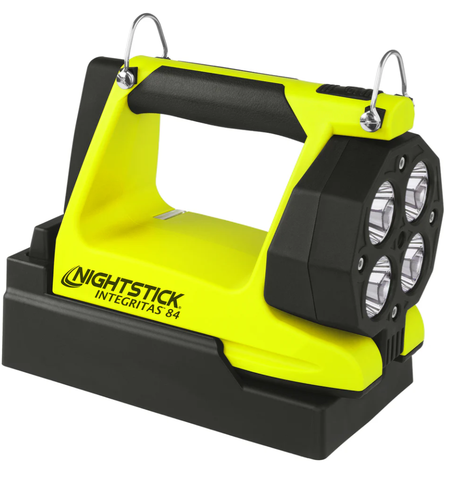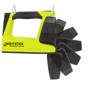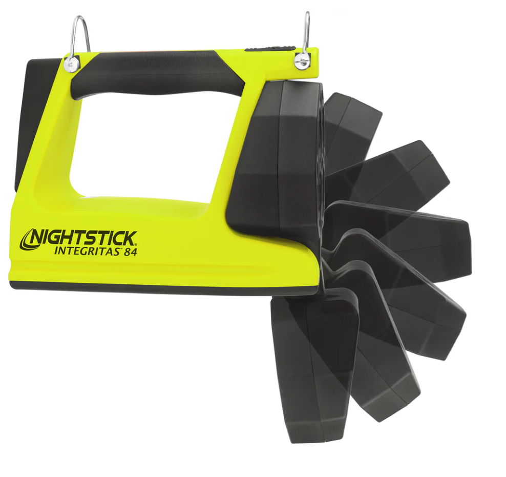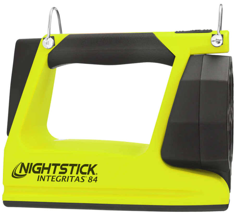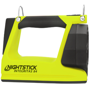 Nightstick (XPR-5584GMX) INTEGRITASƒ?› 84 Intrinsically Safe Rechargeable Lantern delivers a powerful 600 lumens of scene-filling light for up to 13 hours, generated by four LEDs housed in a 180-degree articulating head for maximum versatility. By holding down the switch, you can activate a battery-saving low mode of 250 lumens, extending runtime to an impressive 25 hours when the job demands extended use. Designed to function both as a handheld lantern and a portable area light, the 5584 is equipped with a rear-mounted rubber base pad that includes a 25 lb pull-force rare earth magnet, allowing for convenient hands-free and adjustable scene lighting whenever required. Built from thick-walled glass-filled nylon and weighing just 2 pounds 11 ounces, the 5584 is tough enough to withstand the harshest industrial environments. The over-moulded rubber handle and carry strap provide excellent grip and retention, while two bright green rear-facing LEDs ensure your location is easy to spot, enhancing safety and awareness in smoke, dust, or low-visibility conditions.