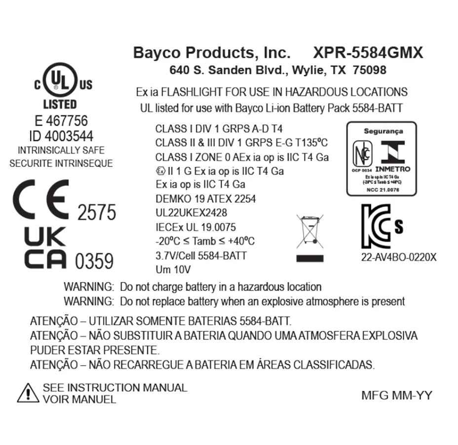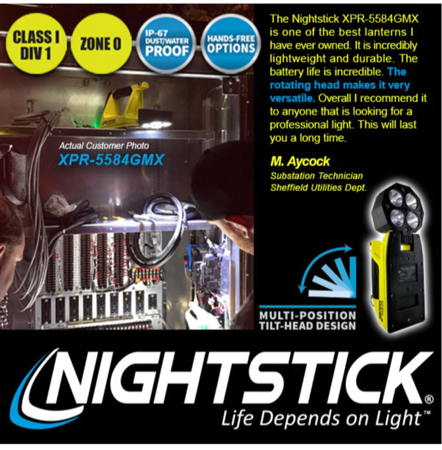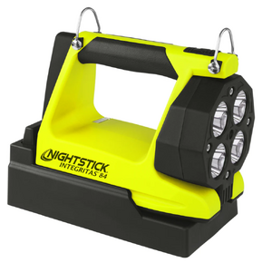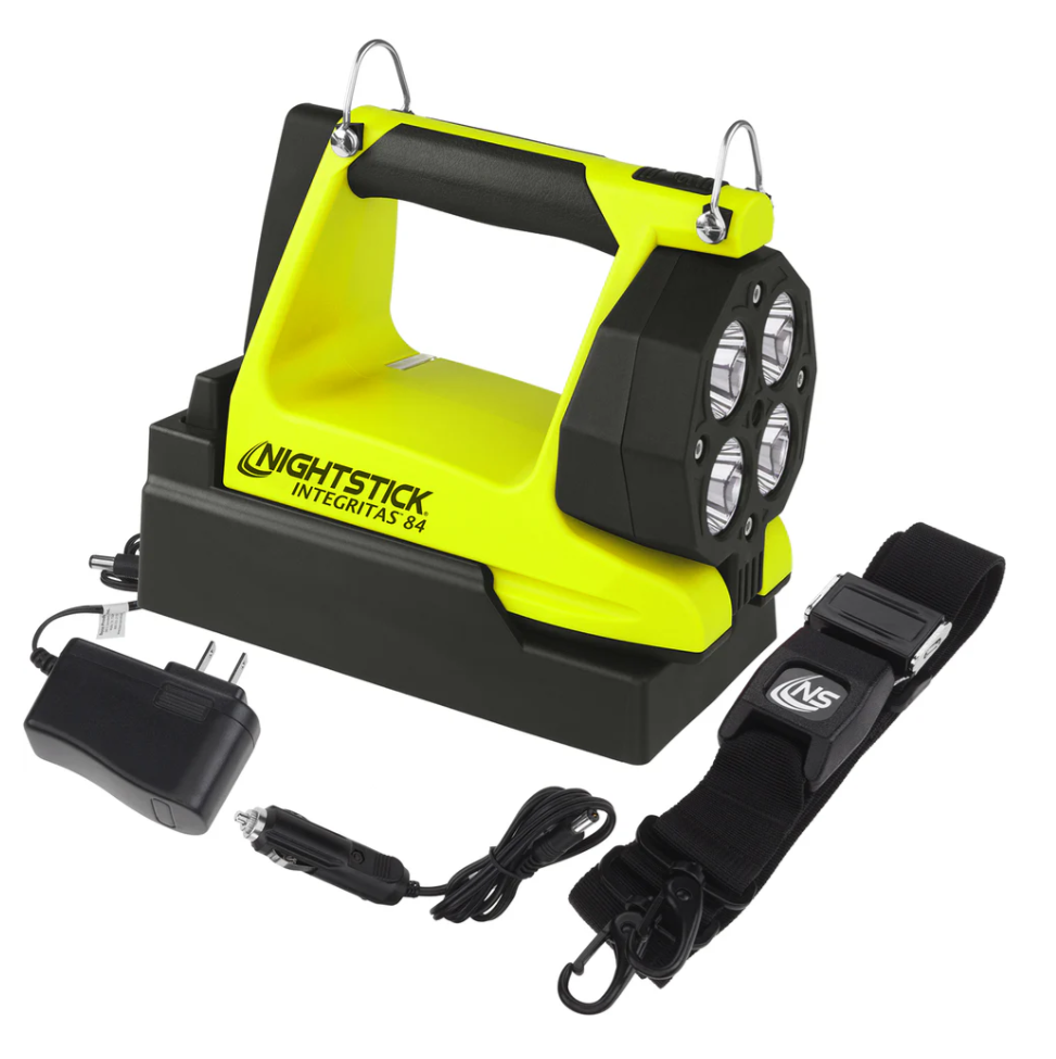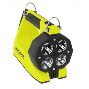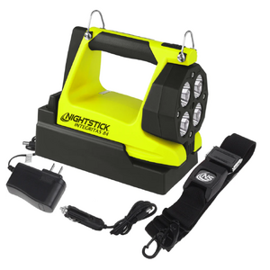 Nightstick (XPR-5584GMX) INTEGRITASƒ?› 84 Intrinsically Safe Rechargeable Lantern delivers a powerful 600 lumens of scene-filling light for up to 13 hours, generated by four LEDs housed in a 180-degree articulating head for maximum versatility. By holding down the switch, you can activate a battery-saving low mode of 250 lumens, extending runtime to an impressive 25 hours when the job demands extended use. Designed to function both as a handheld lantern and a portable area light, the 5584 is equipped with a rear-mounted rubber base pad that includes a 25 lb pull-force rare earth magnet, allowing for convenient hands-free and adjustable scene lighting whenever required. Built from thick-walled glass-filled nylon and weighing just 2 pounds 11 ounces, the 5584 is tough enough to withstand the harshest industrial environments. The over-moulded rubber handle and carry strap provide excellent grip and retention, while two bright green rear-facing LEDs ensure your location is easy to spot, enhancing safety and awareness in smoke, dust, or low-visibility conditions.