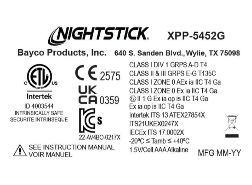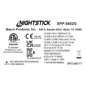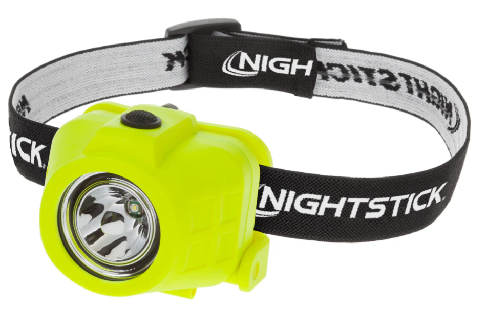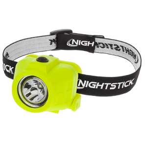 Nightstick (XPP-5452G) is a 3 AAA dualƒ??function headlamp that is cETLus, ATEX, IECEx, INMETRO and KOSHA listed as Intrinsically Safe. It features a multiƒ??position tilt head design and comes with an elastic head strap with a nonƒ??slip lining, as well as a heavyƒ??duty rubber strap for use on a hard hat. The topƒ??mounted switch allows the user to select either high or low brightness spotlight operation, providing versatility across different tasks.