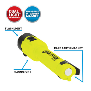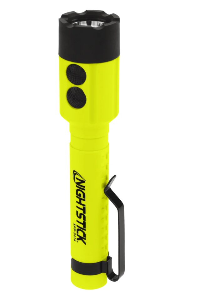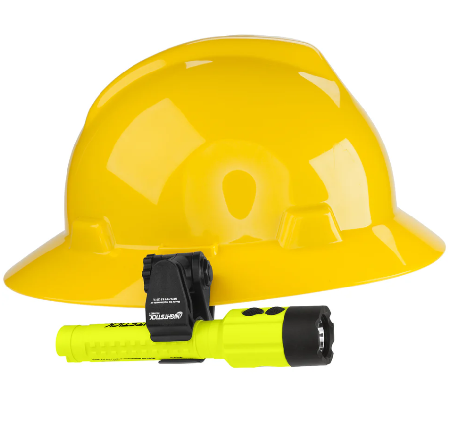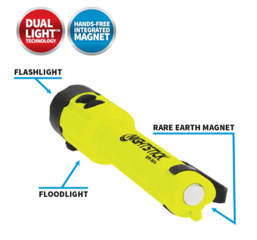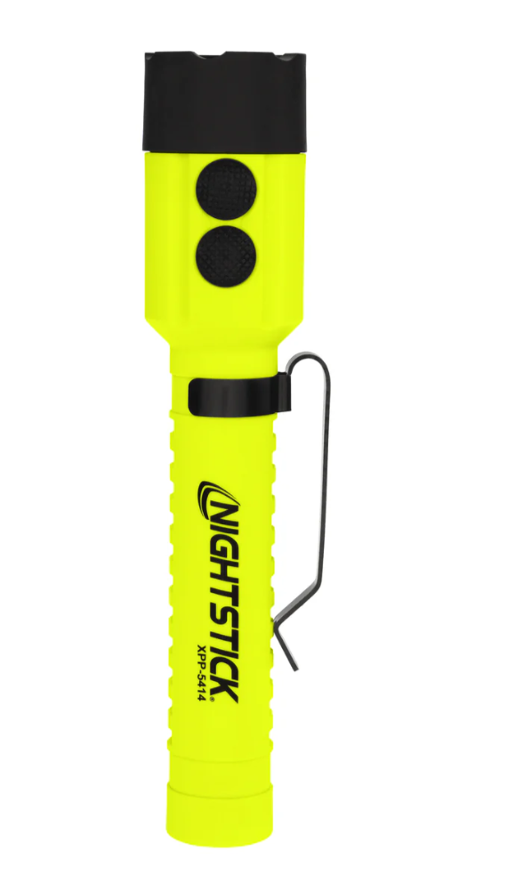 Nightstick (XPP-5414GX-K01) is an Intrinsically Safe (cETLus, ATEX Zone 0 and IECEx) Dual-Light LED torch that delivers peak performance in hazardous work environments. The top-mounted buttons allow you to activate the torchƒ??s focused beam for distance lighting or the floodlightƒ??s wide beam for close-up illumination, and for maximum safety and functionality you can switch on both at once in Dual-Light Mode. This all-inclusive kit provides excellent hands-free convenience with an integrated magnet on the tail, a reversible pocket clip and a multi-angle helmet mount, while the mount itself is designed to fit most hard hats, making it practical and versatile for demanding work conditions.
