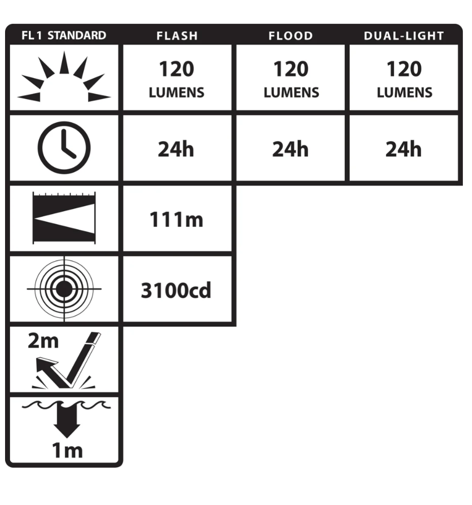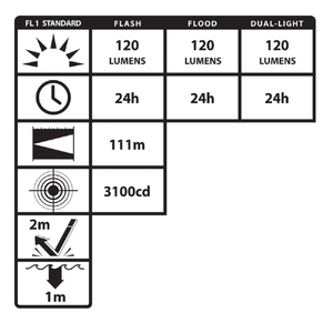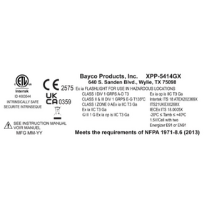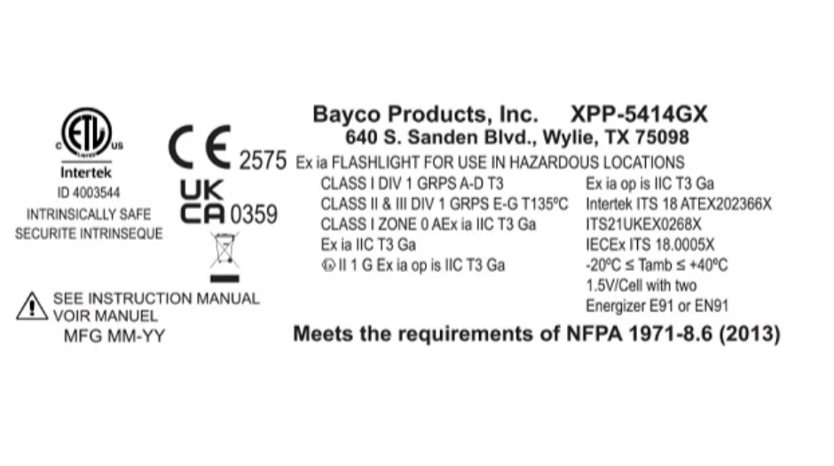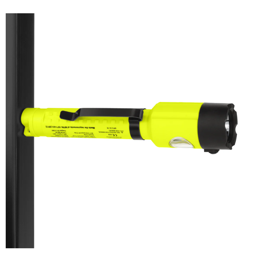 Features cETLus, ATEX and IECEx listed Intrinsically SafeLED technologyFlashlight/Floodlight/Dual-Lightƒ?›Momentary or constant beams of lightFocused flashlight beam for distance illuminationUnfocused floodlight for close-up illuminationDual-Light Mode (flashlight and floodlight for maximum safety and utility)Dual top-mounted switchesGlass-filled nylon polymer housingIntegrated magnet on base and reversible pocket clip?ÿMeets requirements for NFPA-1971-8.6 (2013)IP-67 Dustproof/WaterproofChemical, heat and impact resistantIncludes reversible pocket clipIncludes NS-HMC7 multi-angle helmet mount2 AA batteries (Not included)Limited Lifetime Warranty