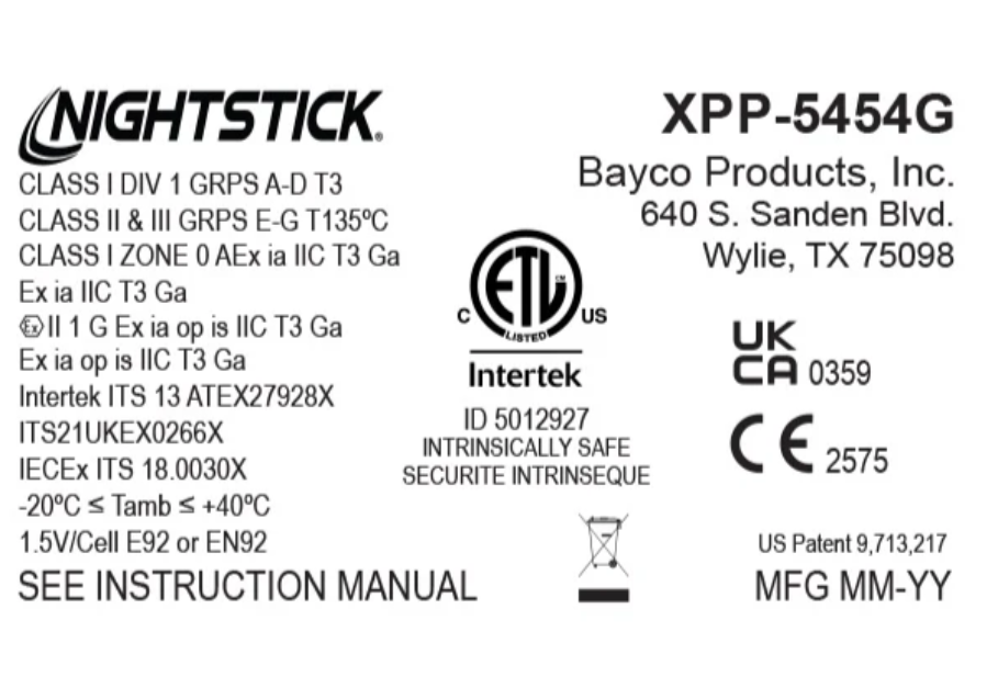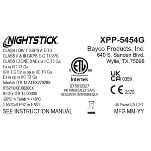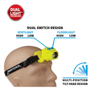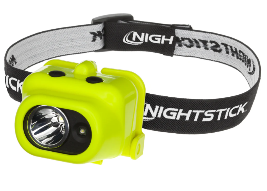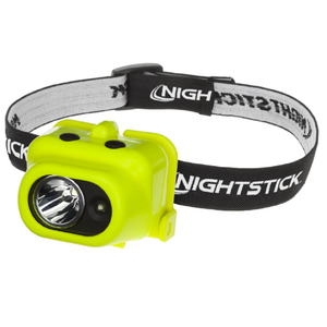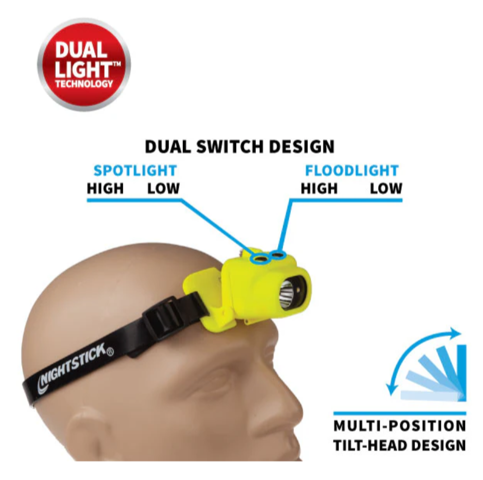 Nightstick (XPP-5454G) is a 3 AAA Multiƒ??Function Dualƒ??Light headlamp that is cETLus, ATEX Zone 0, INMETRO, UKCA and IECEx listed as Intrinsically Safe. It features a multiƒ??position tilt head design and comes with an elastic head strap with a nonƒ??slip lining, as well as a heavyƒ??duty rubber strap for use on a hard hat. The dual topƒ??mounted switches allow the user to select high or lowƒ??brightness spotlight, high or lowƒ??brightness floodlight, or Dualƒ??Light mode, which combines both the spotlight and floodlight simultaneously for maximum safety and lighting versatility.