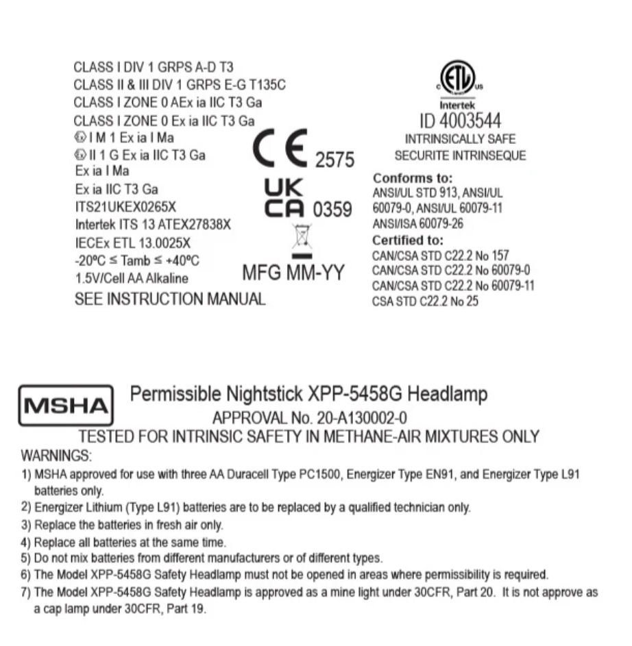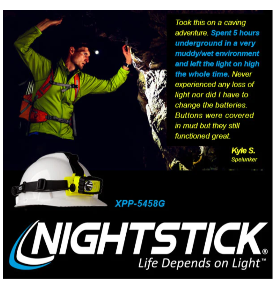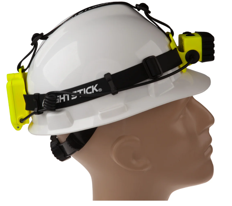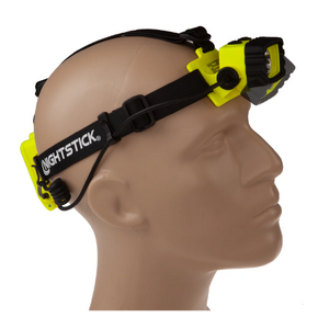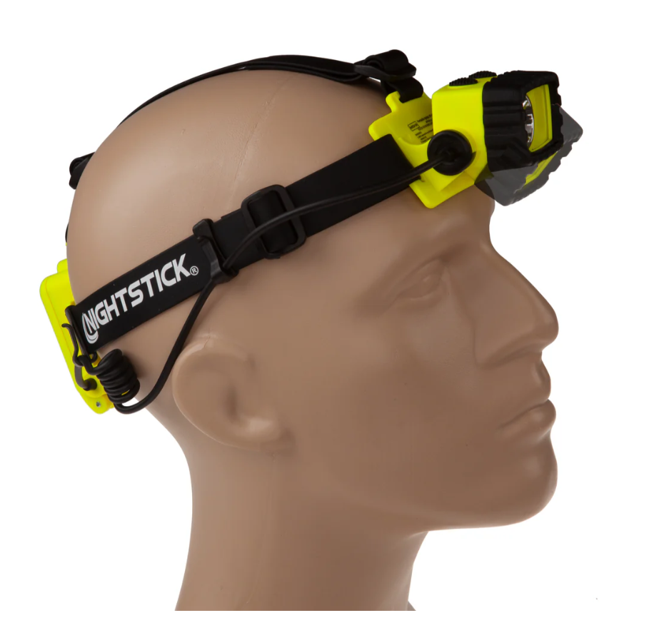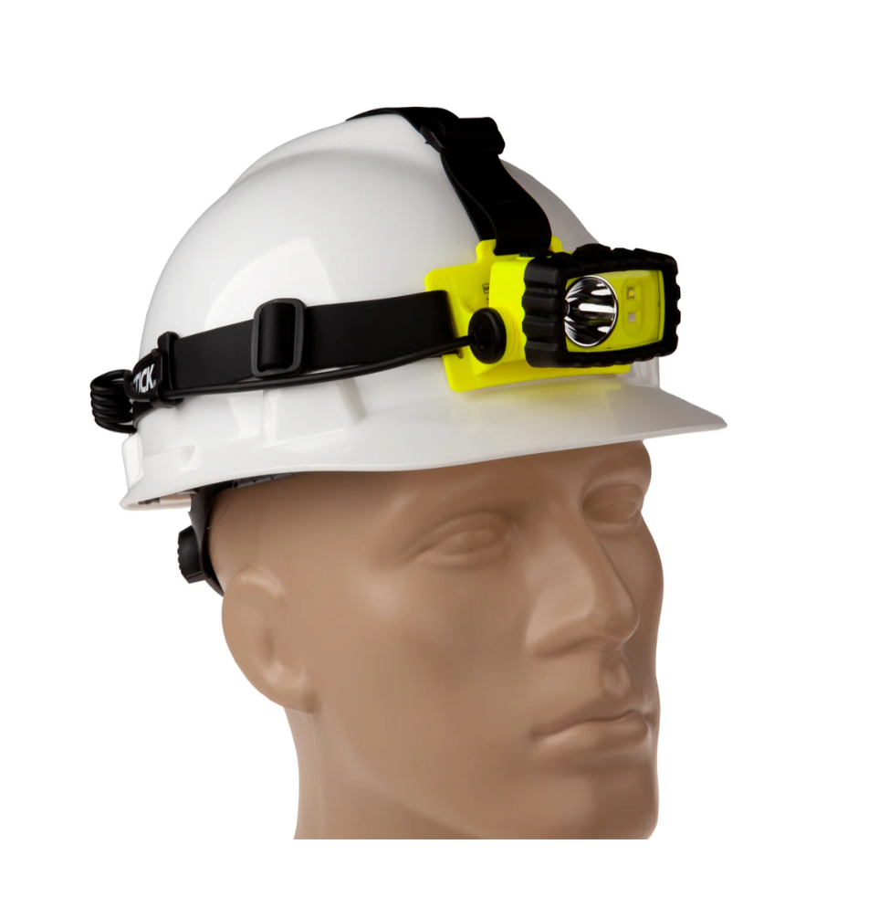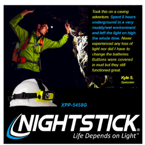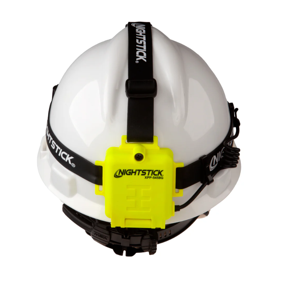 Nightstick (XPP-5458G) is a Dualƒ??Light multiƒ??function headlamp that is cETLus, ATEX, IECEx, UKCA and MSHA listed as Intrinsically Safe Permissible. It features a multiƒ??position tiltƒ??head design with a rearƒ??mounted battery compartment, and comes with both an elastic head strap with a nonƒ??slip lining and a heavyƒ??duty rubber strap for use with hard hats. The topƒ??mounted dual switches provide userƒ??selectable operation of a spotlight, a fullƒ??power white floodlight, a standard white floodlight and a green floodlight, delivering versatile performance across a wide range of applications.
