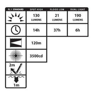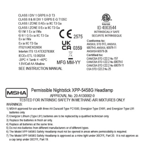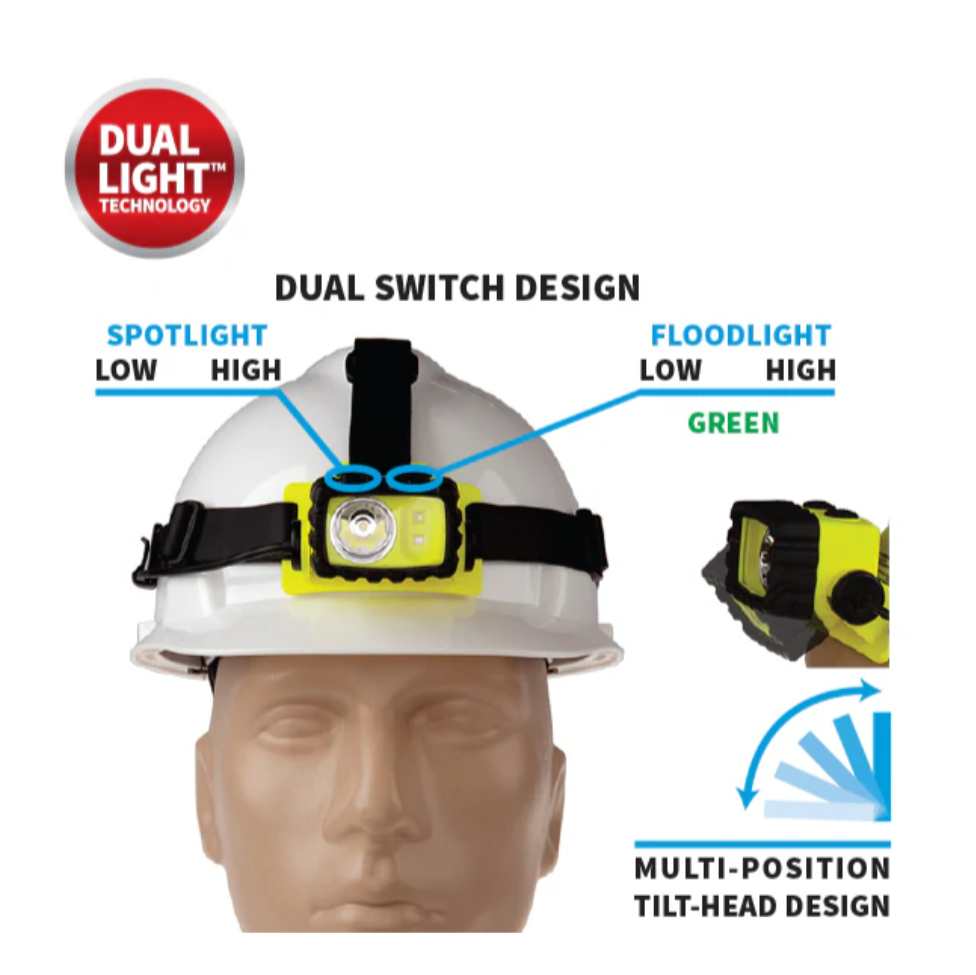 Features cETLus, ATEX, IECEx, UKCA and MSHA listed Intrinsically Safe PermissibleLED technologySpotlight ƒ?? High/Low-brightness white floodlight ƒ?? green floodlightFocused spotlight beam for distance illuminationUnfocused wide-beam floodlight for close-up illuminationGreen colored floodlight for preservation of night visionDual-Lightƒ?› (spotlight & white floodlight mode at same time) for maximum versatilityEngineered polymer housingDual switches located on top of lightAdjustable ratchet tilt headNon-slip elastic head strapHeavy-duty rubber strap for hard hat applicationsWaterproofImpact & chemical resistant3 AA alkaline batteries (included)